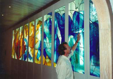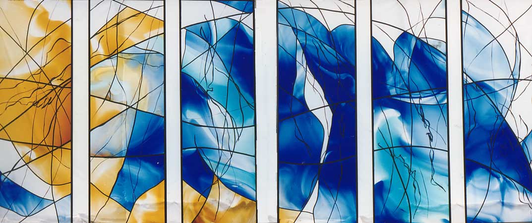 Technik: Abgerissene Überfanggläser, bemalt, gebrannt und in Blei gefasst Grösse: pro Feld: 55cm X 167cm
